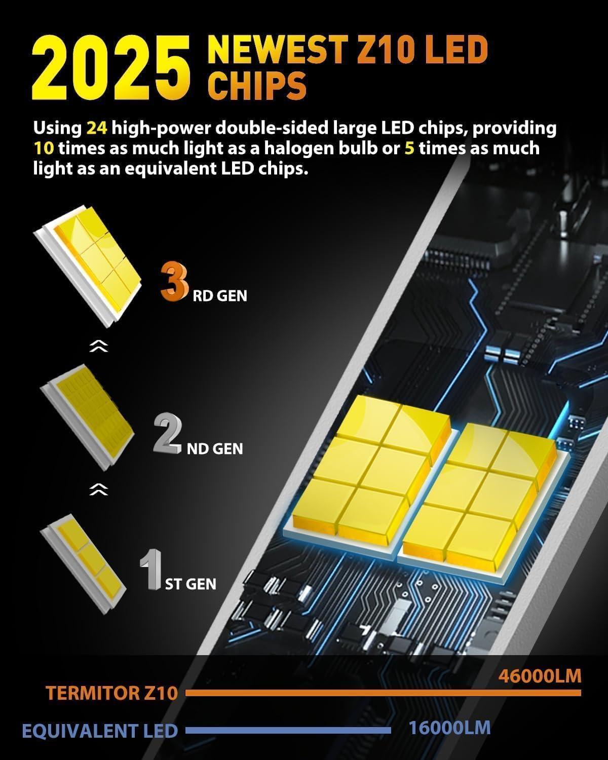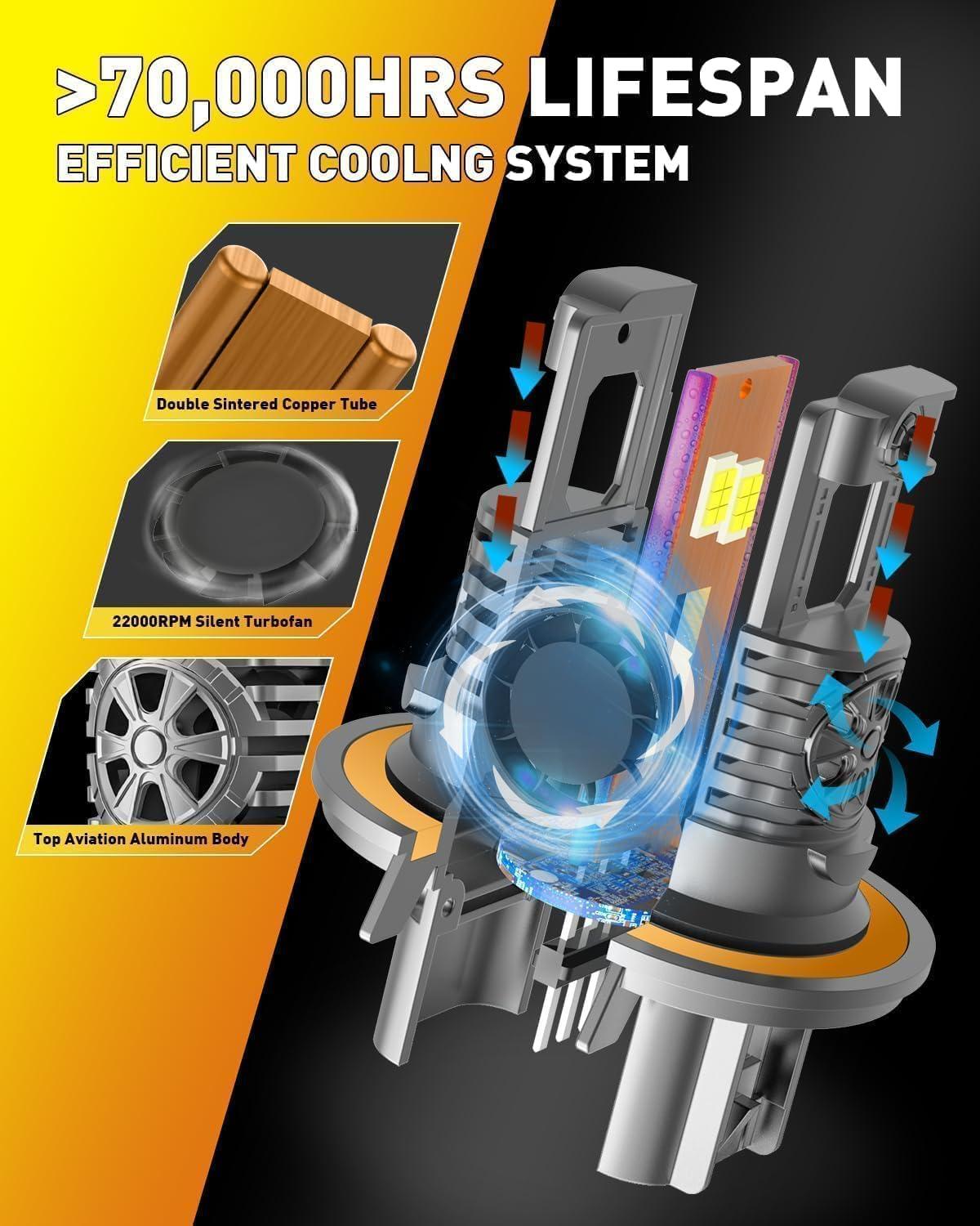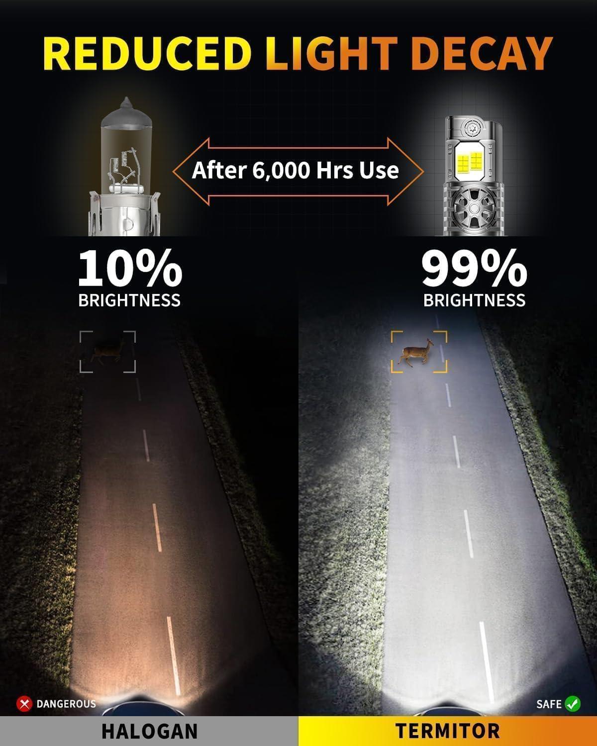 Enhanced Durability: Designed to endure extreme weather and rigorous use, these H1 fog lights are crafted from premium aerospace-grade aluminum for long-lasting performance and reliability. With a high-speed 22,000 RPM cooling fan, Termitor H1 dual beam bulbs provide exceptional cooling and boast over 70000 hours of stable, continuous operation