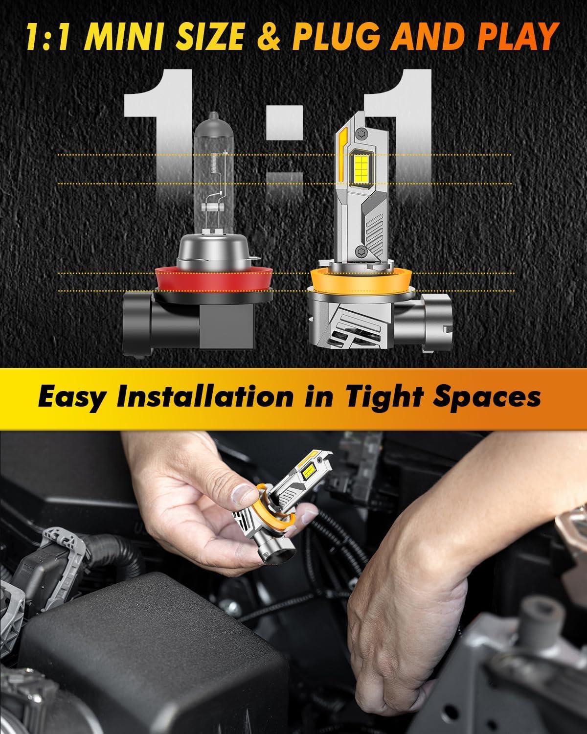 Easy 3-Minute Installation: The new generation of groundbreaking upgraded H11/H8/H9/H16 9005/HB3 fog light bulbs not only eliminates the need for external driver boxes and wires, but is also 20% smaller and lighter than other H11/H8/H9/H16 9005/HB3 bulbs – real 1:1 the original halogen bulb – and the sleek design seamlessly solves common installation challenges, including compatibility with dust covers