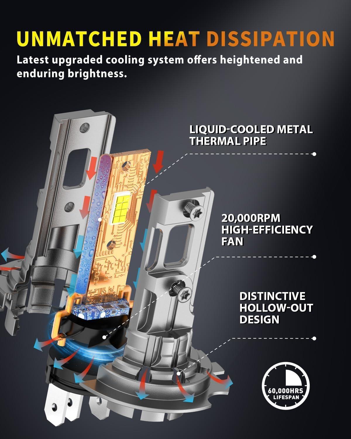 Robust Construction — 70,000-Hour Service Life: Built with aerospace-grade aluminum and a hollowed design, these H4/9003/HB2 bulbs include a 22,000 RPM silent cooling fan. Their IP68-rated sealing guarantees consistent operation even in extreme environments like snowstorms and dense fog