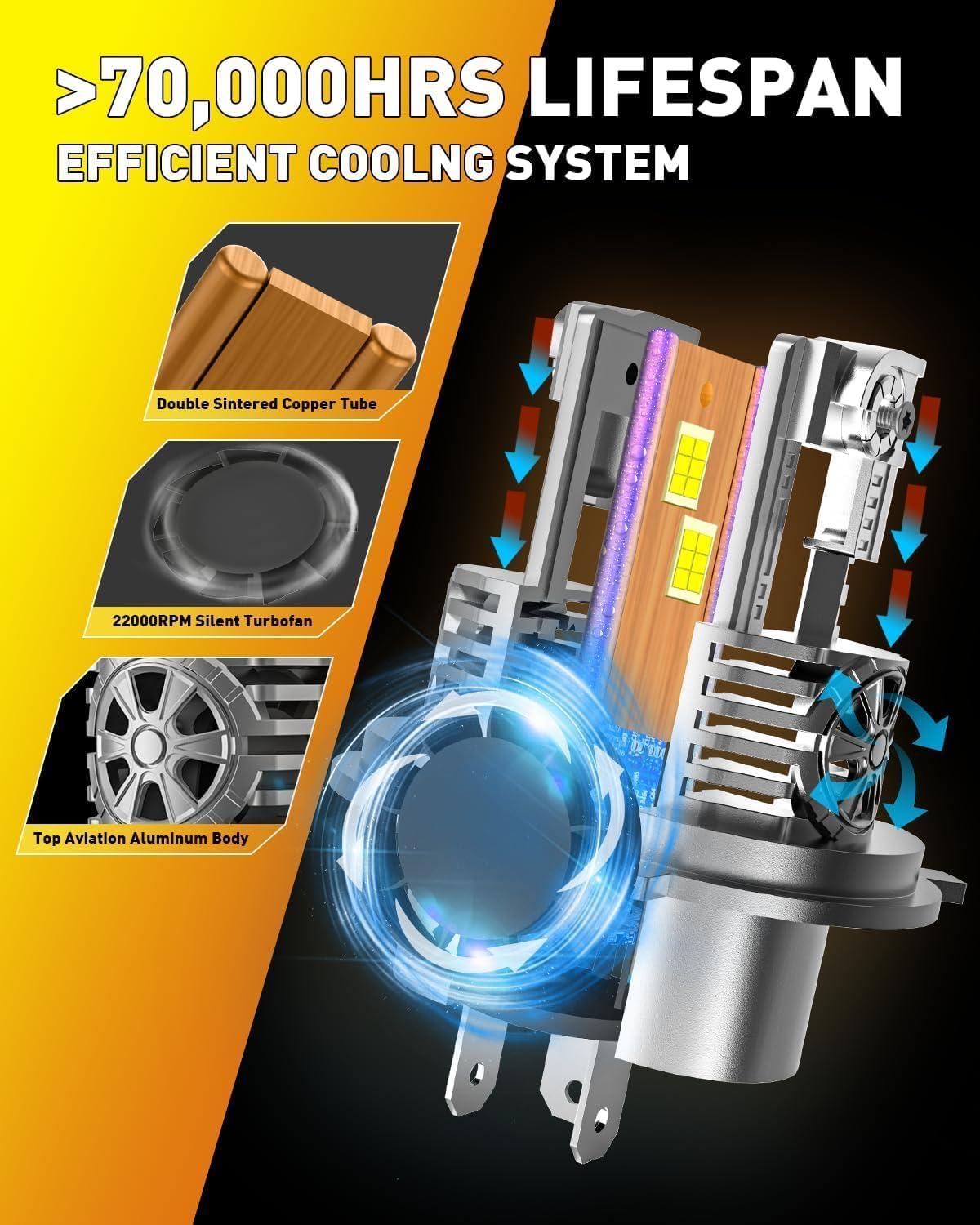 Unrivaled Power and Performance: Crafted with precision from premium aviation-grade aluminum, complemented by a thermostatic copper plate and a high-speed 22,000RPM cooling fan, our H13 9008 driving lights feature an unparalleled cooling system. This ensures swift heat dissipation, maintaining stable and uninterrupted operation. With an extended average lifespan of 75,000 hours per light, you can count on reliable performance mile after mile